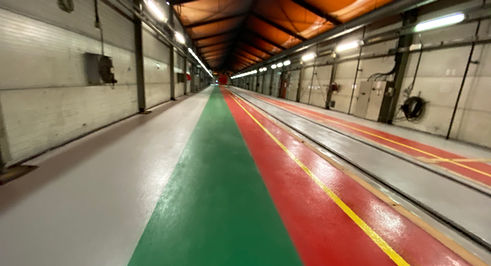 Elsewhere, the floor had a variety of different functions, with Green areas being Walkways, and Grey areas for other a combination of storage and undercarriage works and in each of these areas we provided a 2mm thick Fibre Reinforced Epoxy Regulating Layer followed by pigmented epoxy body layers with differing mix designs, to suit their intended function. Lastly, Yellow coatings were then added to retained Duct Covers, and our team formed safety line markings throughout the building.